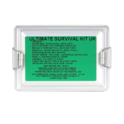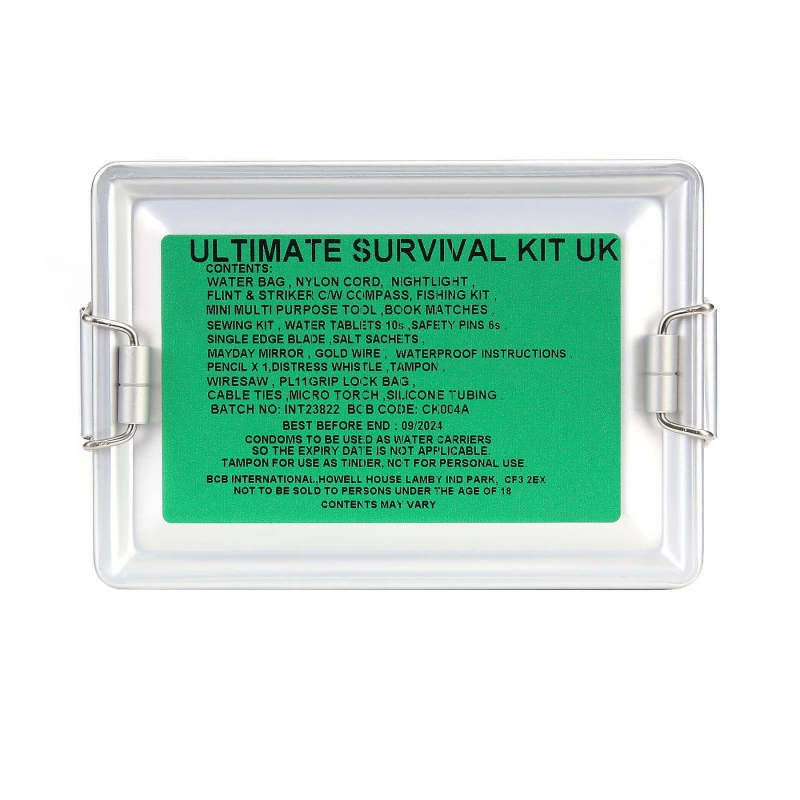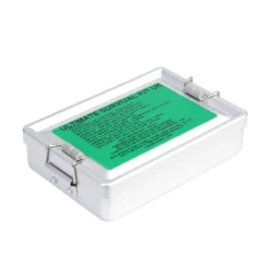 Ce kit de survie est emballé dans la mini-boîte légère BCB avec un joint en caoutchouc et des fermoirs pour le rendre étanche à l’eau lorsqu’il est fermé.