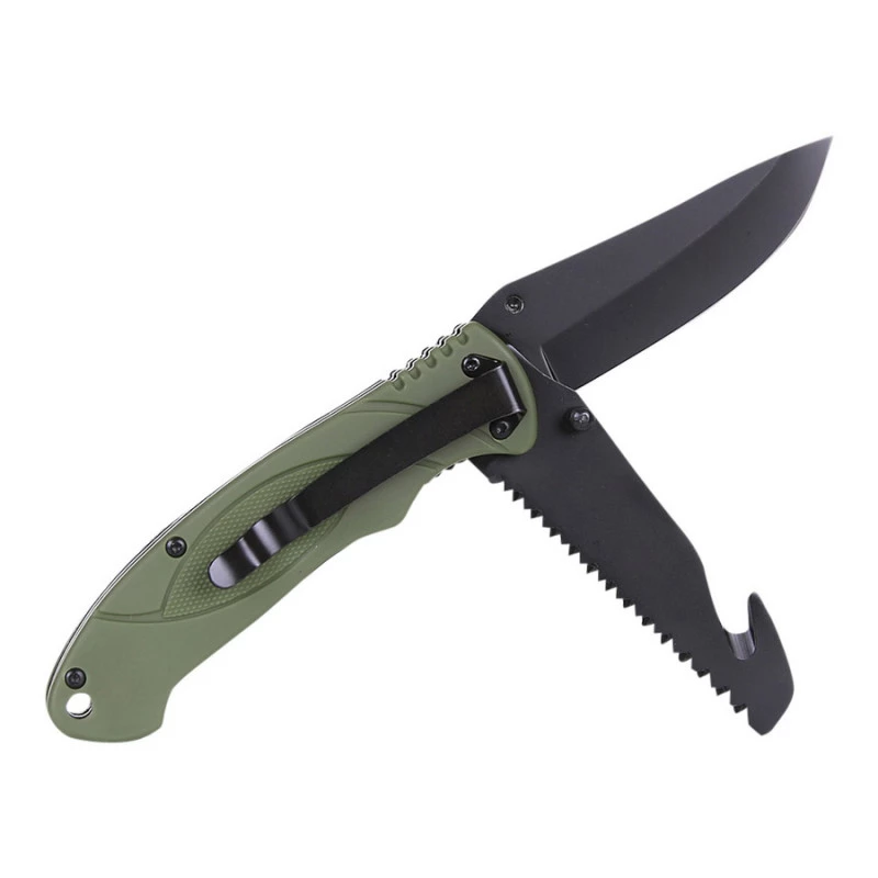 Ce couteau Bushcraft est dotè de deux lames à verrouillage arrière en acier inoxydable avec un revêtement noir. Il a deux lame, une lame de couteau à usage général. La deuxième lame est pour couper le bois ou les branches et a un crochet Gut intégré pour couper les cordes ou les fils éléctriques. Ce couteau Bushcraft est votre compagnon idéal pendant toutes vos aventures en plein air.