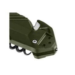 Le manche est constitué de deux plaquettes en polymère chargé de fibres de verre. Ces plaquettes sont vissées à la mécanique par des vis en acier inoxydable dont l’une d’elle loge astucieusement une lame coupe sangle. Cette lame courbe et interchangeable est conçue pour couper des sangles, des cordes et des ceintures de sécurité pour favoriser l’extraction en cas d’accident.