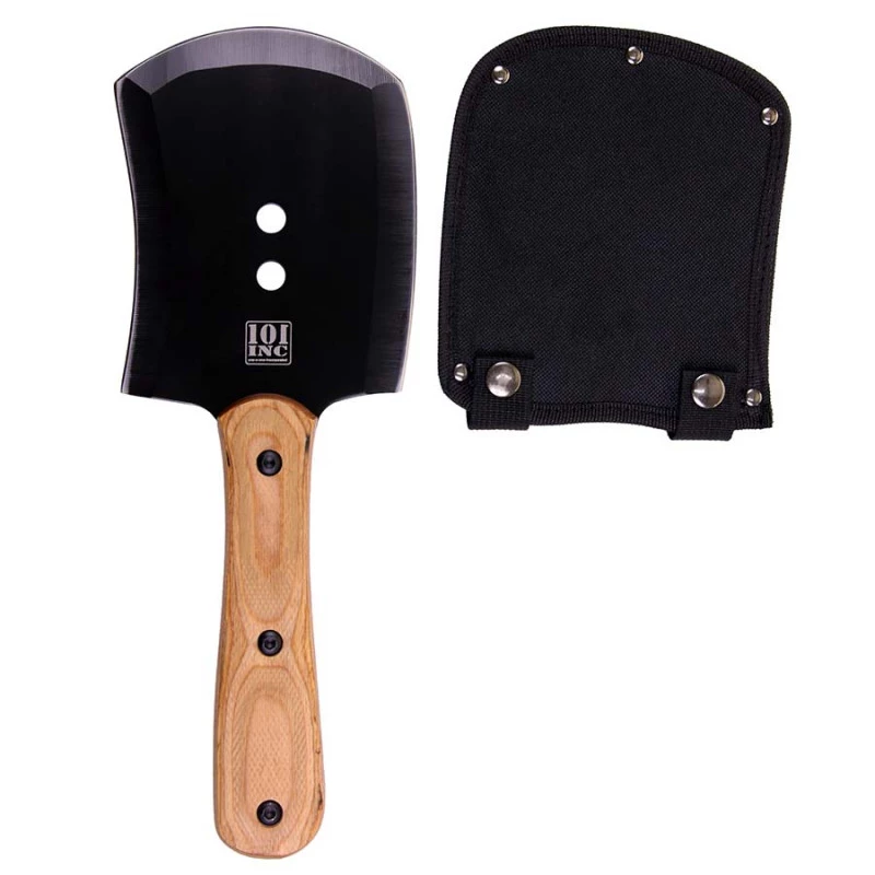 Hachette/pelle multi fonctions avec poignée en bois et housse nylon.