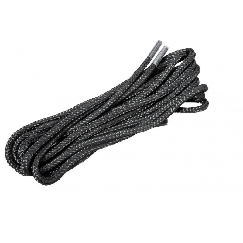 Paire de lacets ronds rigides tressés en polyester 4 ferrages cellulosiques fixes Diamètre : 6,5 mm au repos et 4 mm en tension Longueur : 1,20 m Couleur : noir