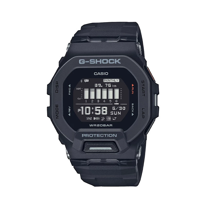 Fine et au look élégant, la montre-bracelet numérique connectée G-SHOCK GBD-200 est robuste grâce à son cadran en verre minéral et son boîtier et son bracelet en résine, un matériau durable et souple.