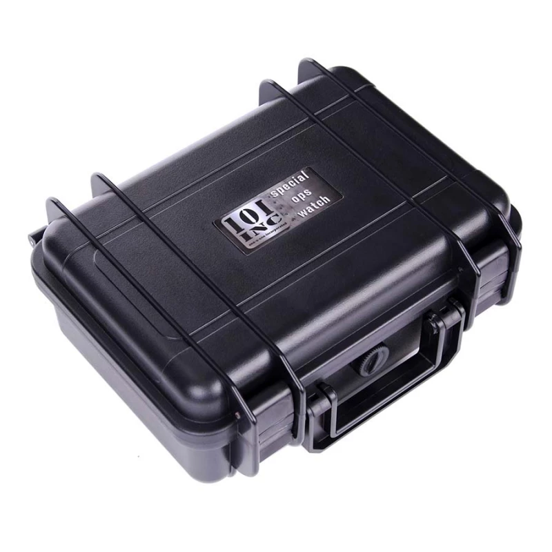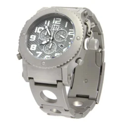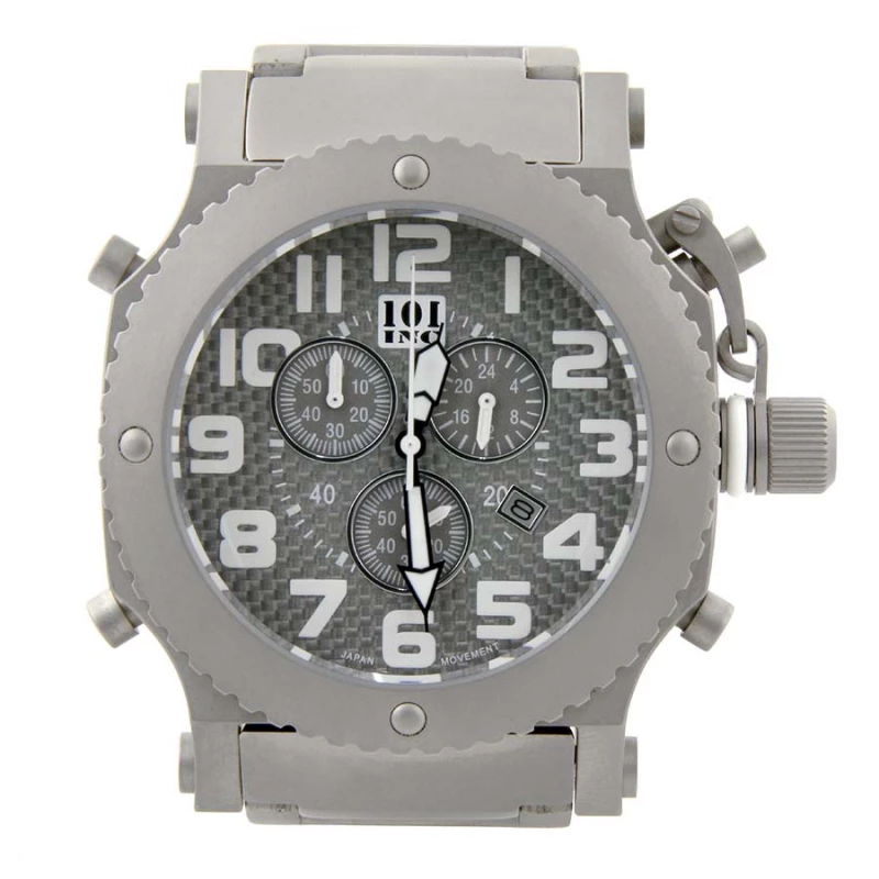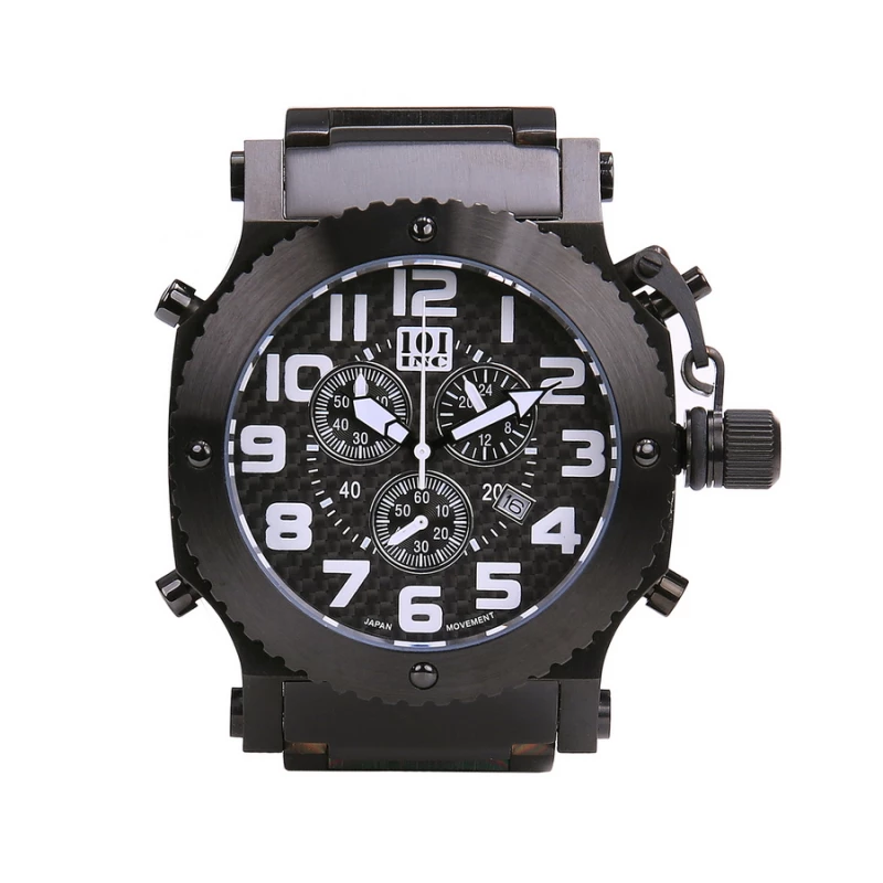 Montre en acier inoxydable Revêtement noir IP Cadran de fibre de verre Chronographe et date 5ATM/50M résistant à l’eau Poids: 180 gr Taille: 45mm (50mm incluant la couronne) Garantie: 2 ans Cette élégante montre 101INC est complètement faite d’acier inoxydable. elle a une nuance noir foncé et des nombres lumineux. L’heure est totalement visible peu importe les circonstances. Le mouvement a un chronographe et une fonction de date(rendez-vous) et la montre a une couronne de vis en bas, un bracelet en acier inoxydable résistant.Toutes les montres 101INC sont durables et waterproof.