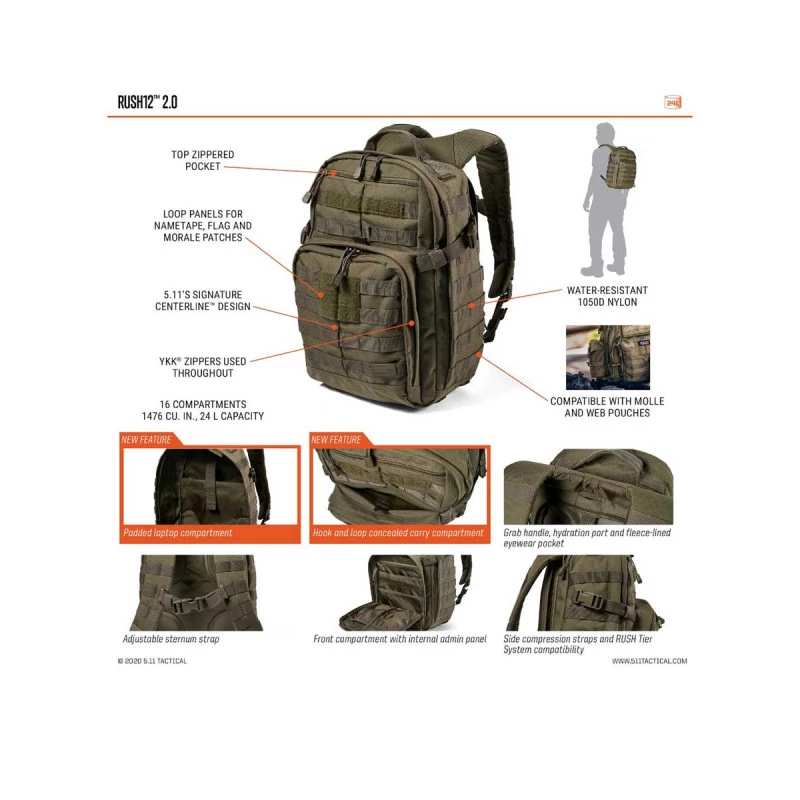 Sac à dos tactique5.11 Rush 12 très résistant et très fonctionnel, il est idéal pour partir en mission ou en trek jusqu’à 24h.