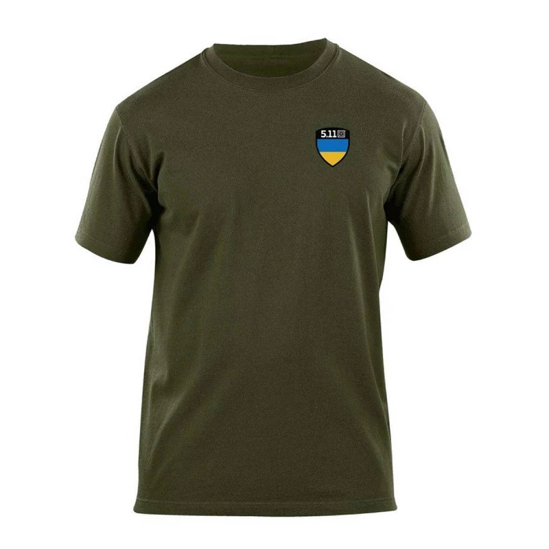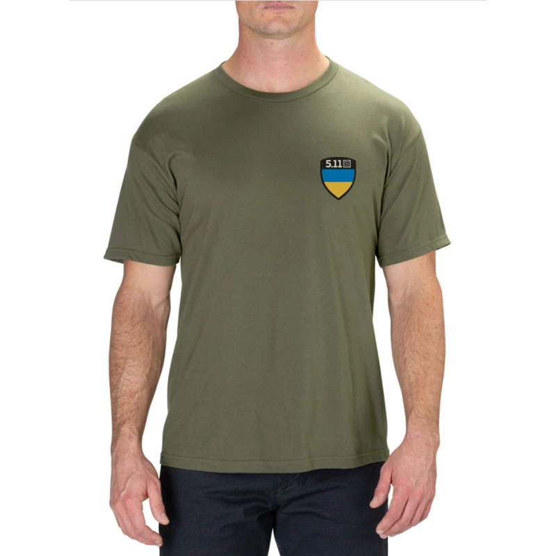 T-shirt édition limitée couleur vert OTAN avec drapeau Ukrainien et logo 5.11 en forme de bouclier.