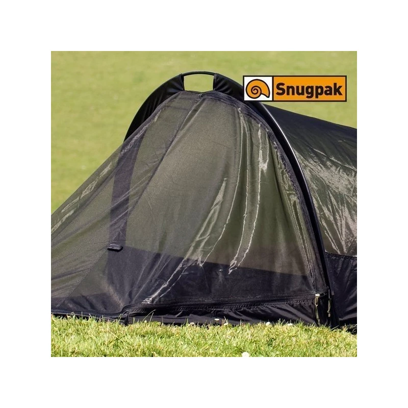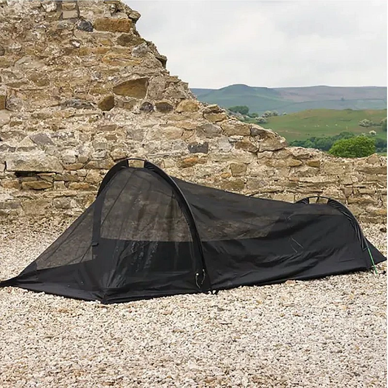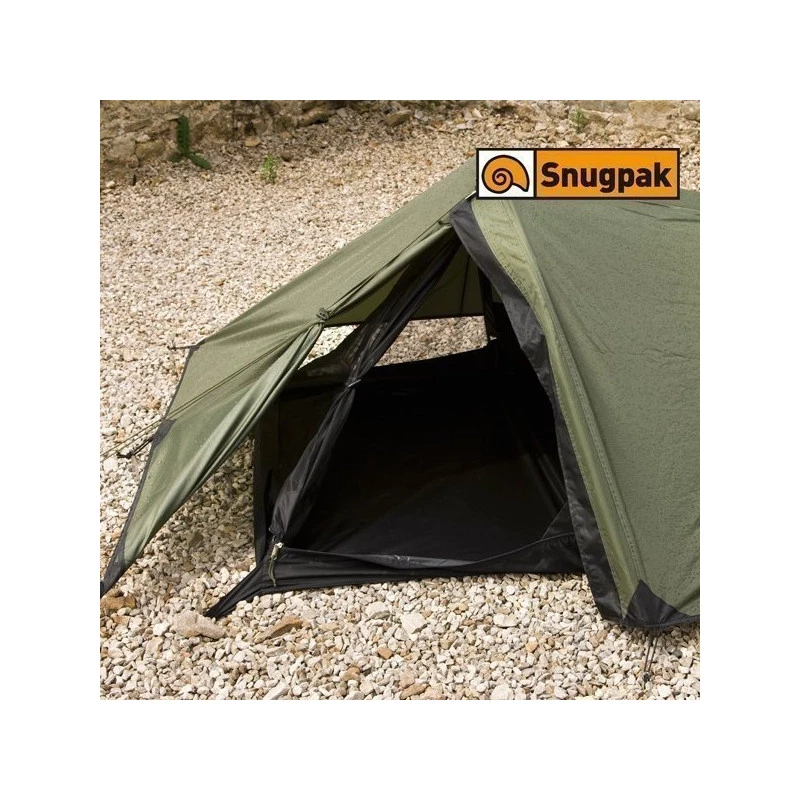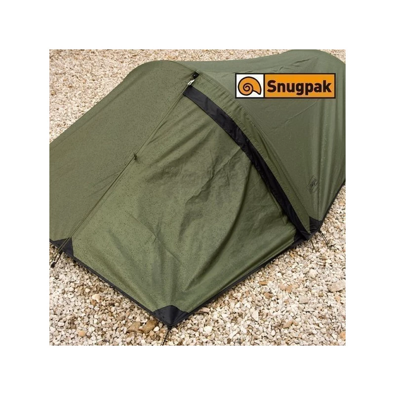Tente tunnel compacte verte olive pour 1 personne avec une très faible signature visuelle grâce à son profil très discret. C’est un abris très simple et rapide à monter pour rester au sec